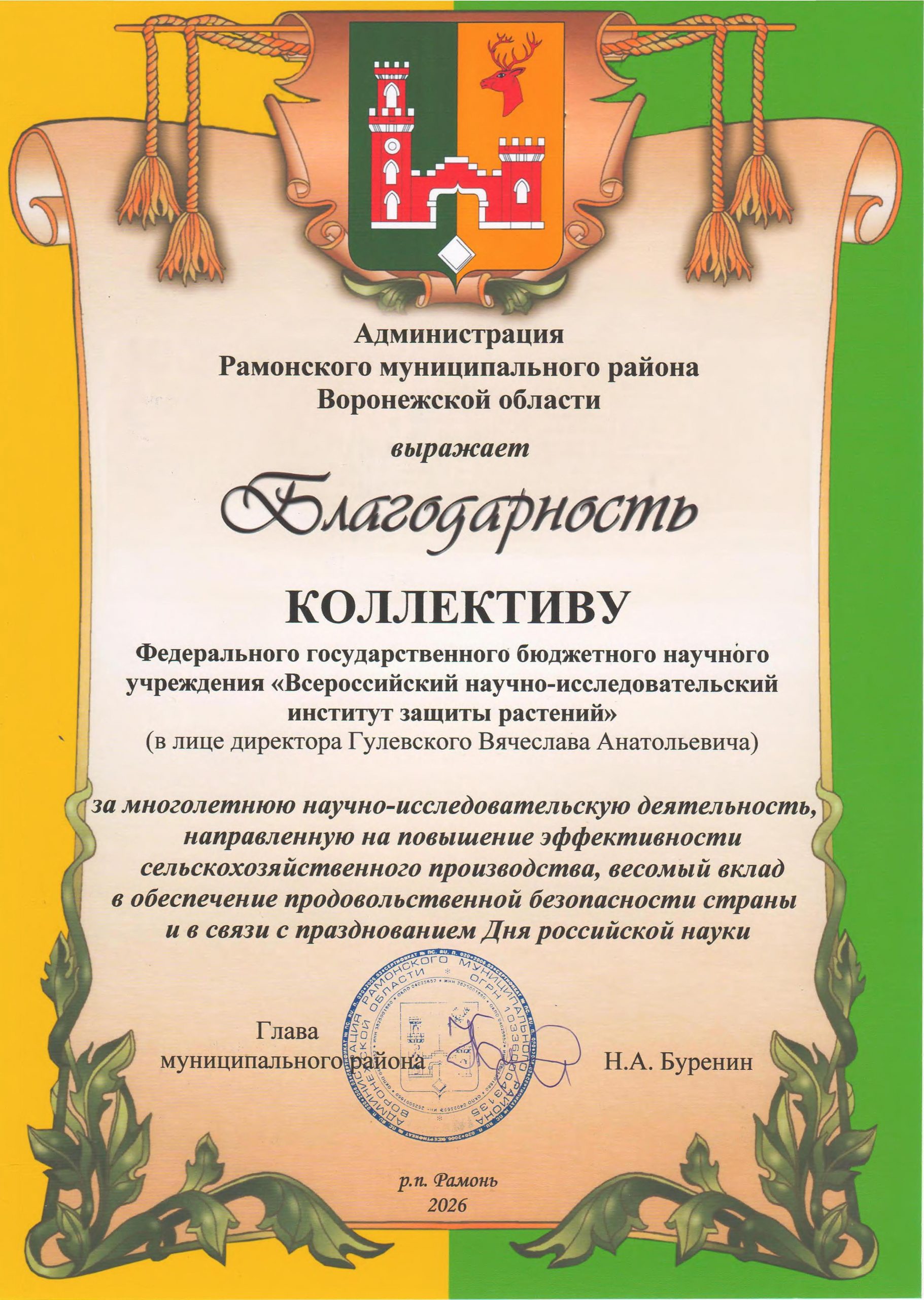 Благодарность коллективу ФГБНУ «ВНИИЗР»